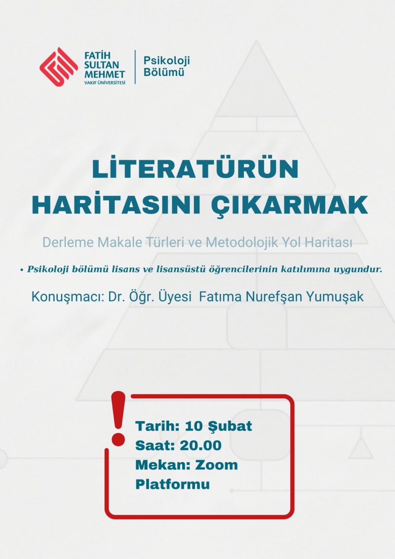 Dr. Öğr. Üyesi Fatıma Nurefşan YUMUŞAK, 10 Şubat günü saat 20.00'de Zoom platformu üzerinden Psikoloji bölümü lisans ve lisansüstü öğrencilerine yönelik derleme makale türleri ve metodolojik yol haritası çıkarmak ile ilgili seminer gerçekleştirecektir.