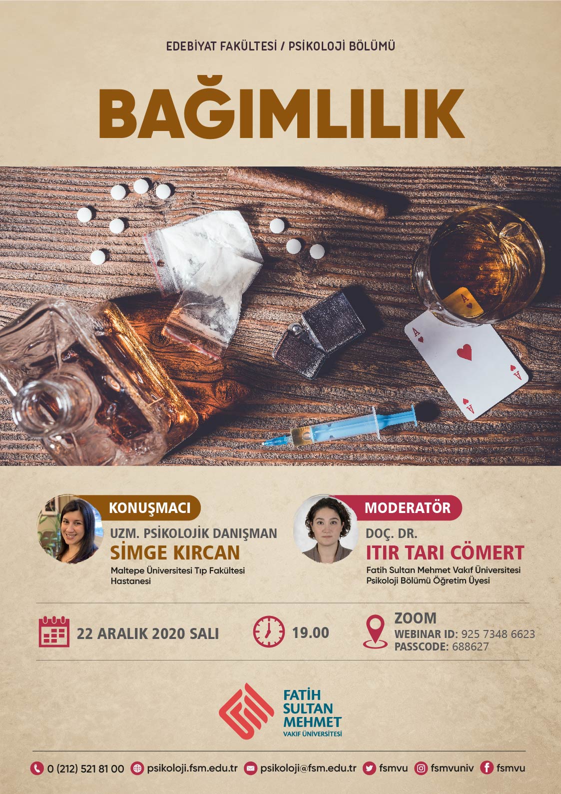 Psikoloji Bölümü'nün düzenlediği "Bağımlılık" başlıklı konferans, Doç. Dr. Itır Tarı Cömert'in moderatörlüğünde Uzman Psikolojik Danışman Simge Kırcan'ın katılımıyla gerçekleştirilecektir.