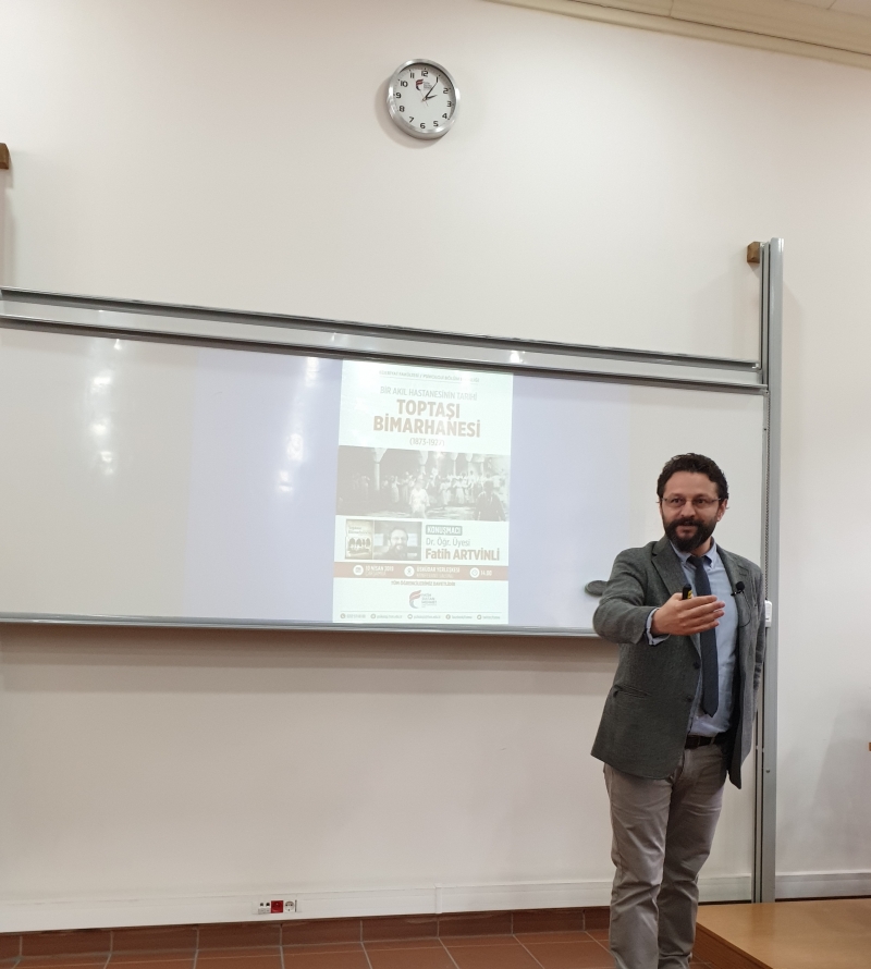 “Delilik, Siyaset ve Toplum-Toptaşı Bimarhanesi” kitabının yazarı, tıp ve psikiyatri tarihçisi Dr. Öğr. Üyesi Fatih Artvinli’nin konuşmacı olduğu konferansta, bugün Edebiyat Fakültemize ev sahipliğe yapan eski Toptaşı Bimarhanesi’nin 19. yüzyıldan günümüze uzanan tarihine ışık tutuldu. 19. yüzyılda dönemin en önemli bimarhanesi konumundaki Süleymaniye Bimarhanesi’nin ıslahı ile temelleri atılan ve bugünkü Bakırköy Ruh ve Sinir Hastalıkları Hastanesi’nin de zeminini oluşturan Toptaşı Bimarhanesi ekseninde dönemin akıl hastalarının durumuna, bimarhanelere yönelik çağdaşlaşma çabalarına, tedavi yaklaşımlarına değinildi. Her dinden, her mezhepten hastanın geldiği bir akıl hastanesi olan ve Mimar Sinan’ın yaşayan yegane yapılarından biri olan Toptaşı Bimarhanesi bir mekan olarak da ele alınarak, bimarhane olduğu dönemdeki yerleşim planı ve kullanılış biçimleri konuşuldu.