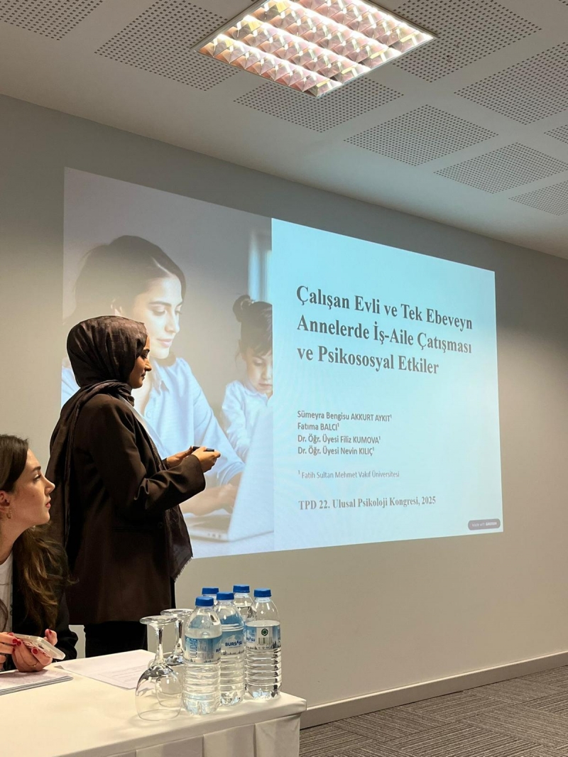 Dr. Öğr. Üyesi Filiz KUMOVA ve Dr. Öğr. Üyesi Nevin KILIÇ danışmanlığında yapılan araştırmayı yürüten yüksek lisans öğrencileri Sümeyra Bengisu AKKURT AYKIT ve Fatıma BALCI ''Çalışan Evli ve Tek Ebeveyn Annelerde İş-Aile Çatışması ve Psikososyal Etkiler'' başlıklı sunumunu gerçekleştirmiştir.