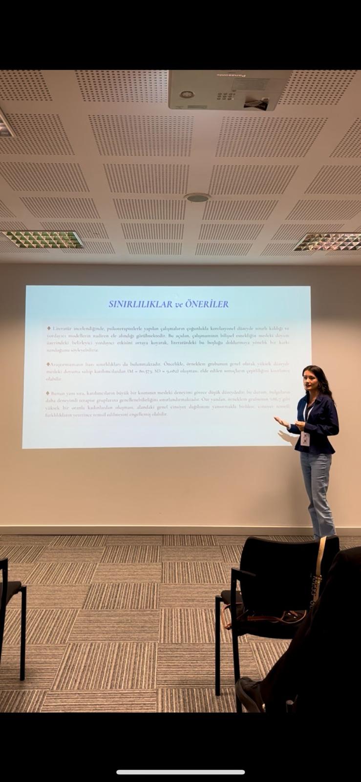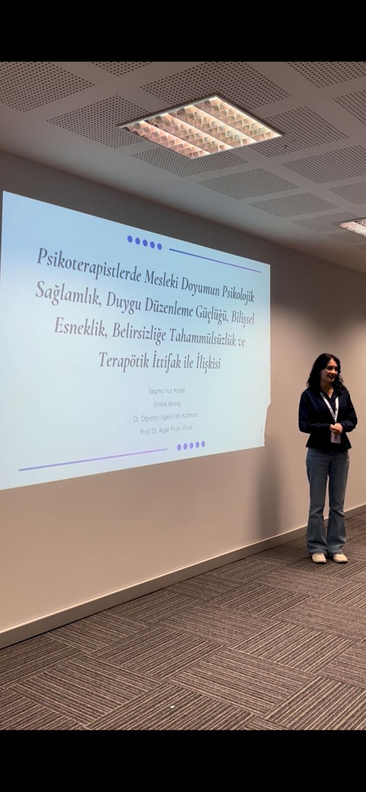 Prof. Dr. Ayşe Pınar VURAL ve Dr. Öğr. Üyesi Filiz KUMOVA danışmanlığında yüksek lisans öğrencilerimiz Şeyma Nur KOÇER ve Emine AKSOY, ''Psikoterapistlerde Mesleki Doyumun Psikolojik Sağlamlık, Duygu Düzenleme Güçlüğü, Bilişsel Esneklik, Belirsizliğe Tahammülsüzlük ve Terapötik İttifak ile İlişkisi'' başlıklı araştırmasını sundu.